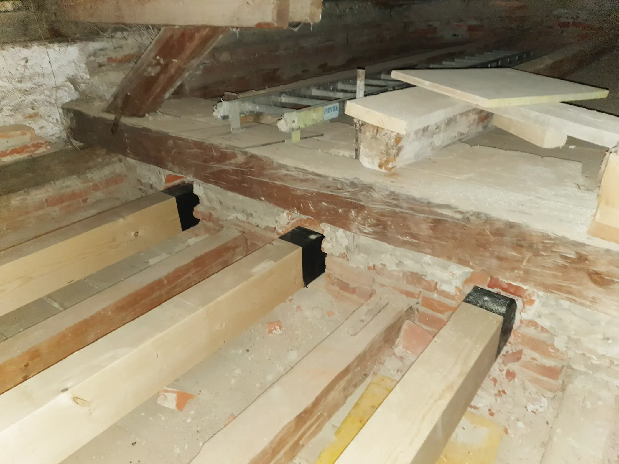 🔹 Verstärkung der Geschossdecken mit neuen Holzbalken zur Ableitung der Wohnraumlasten und Verbesserung des Schallschutzes.